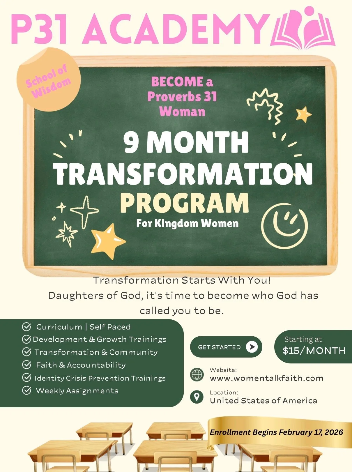 At P31 Academy, we believe that walking with God requires Faith in Action! The Bible states, “my people perish for lack of knowledge.” Daughters of God, it’s time to add to your learning. This is a space where women in Kingdom grow in truth, deepen their relationship with God, and learn how to walk by faith in every area of their lives. Here, we are committed to becoming the woman God has called us to be—through knowledge, wisdom, obedience, discipline, and His Word. Amen!